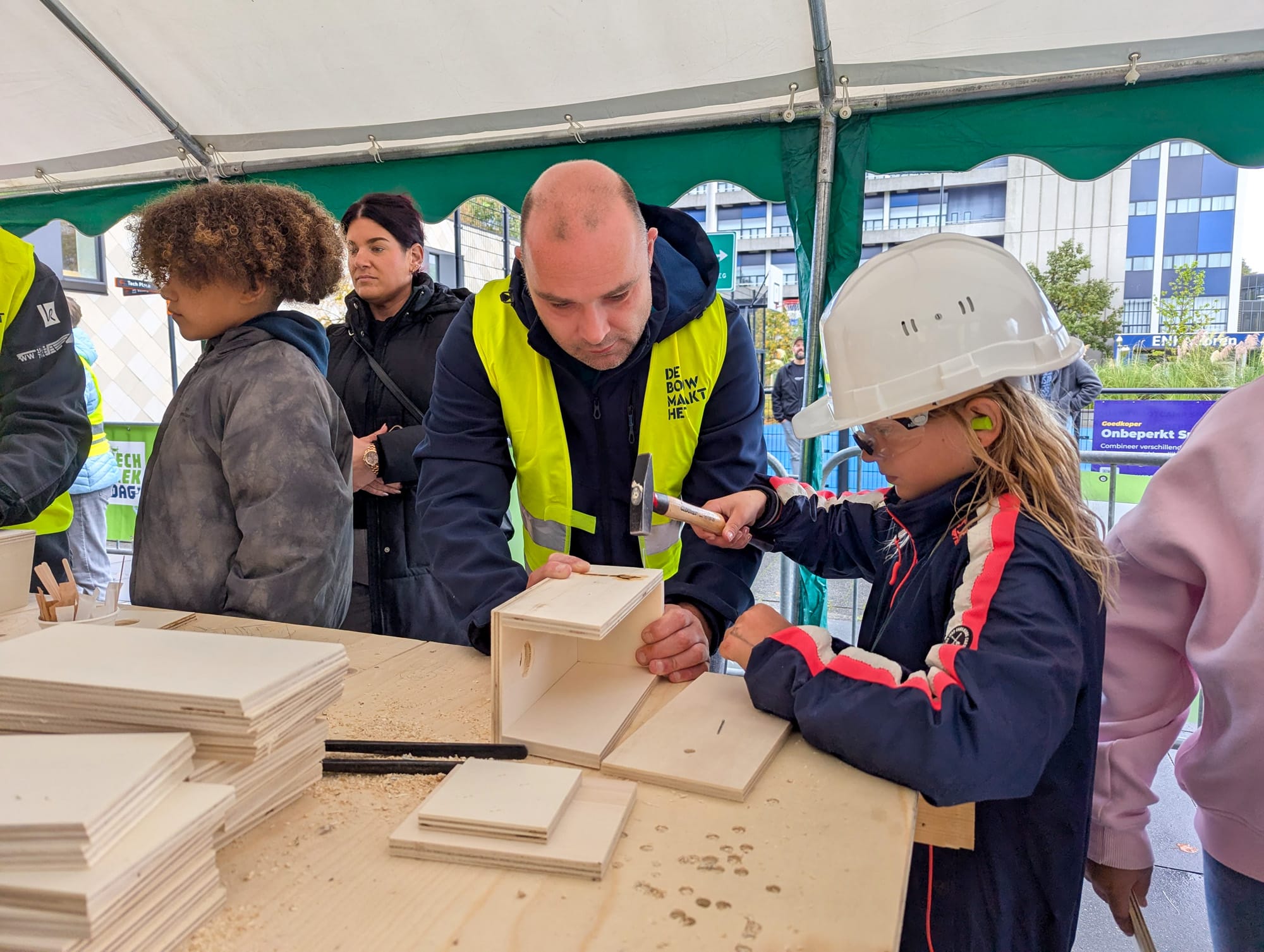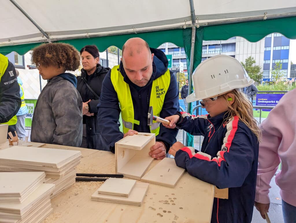 Zowel binnen als buiten waren bedrijven en onderwijsinstellingen aanwezig met doe-activiteiten om te laten zien hoe leuk en veelzijdig techniek is. Lassen, solderen, timmeren of proefjes doen in het laboratorium, er werd volop geëxperimenteerd, gebouwd en ontdekt. Jonah maakte bijvoorbeeld een vogelhuisje “samen met een meneer en via een stappenplan.”
